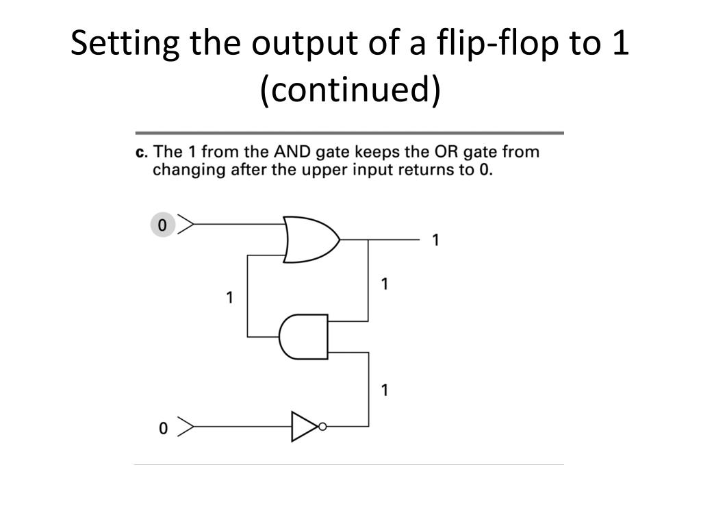 Flip-flops • Flip-flop: A circuit built from gates that can store one bit. • One input line is used to set its stored value to 1 • One input line is used to set its stored value to 0 • While both input lines are 0, the most recently stored value is preserved
