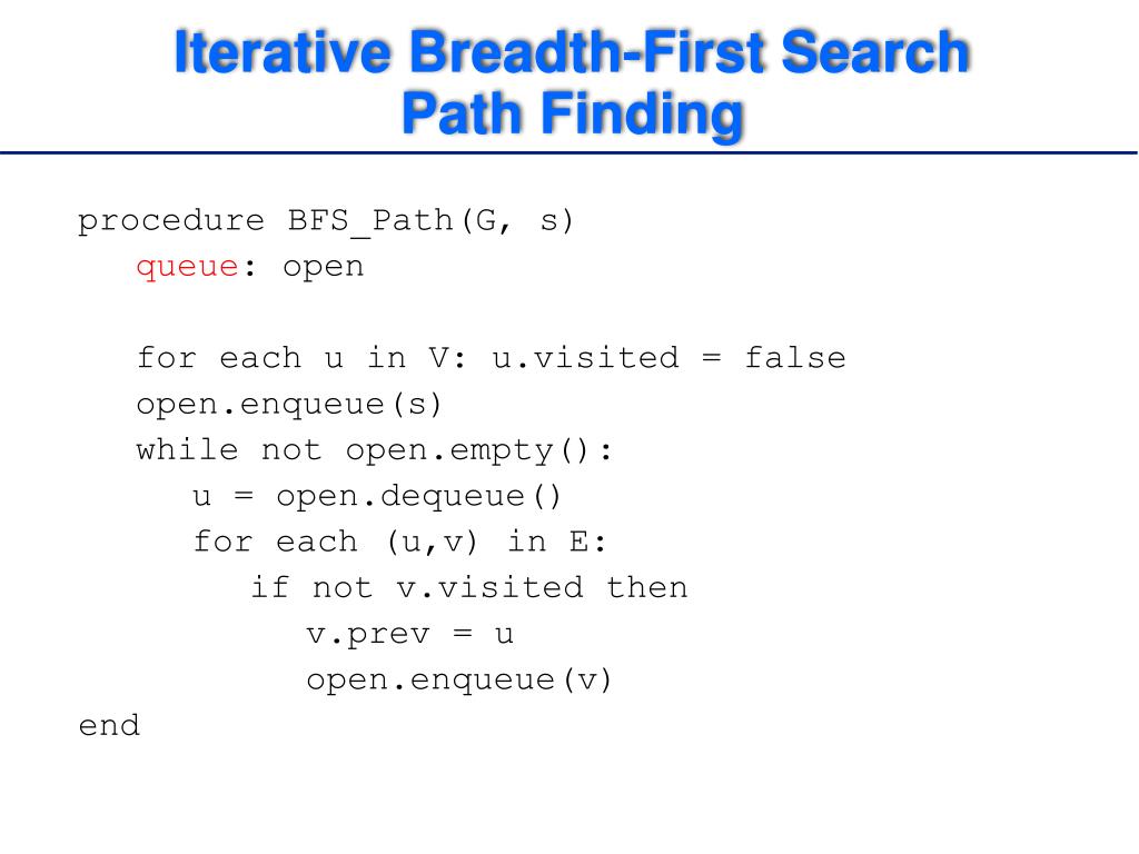 Iterative Breadth-First Search Path Finding procedure BFS_Path(G, s) queue: open for each u in V: u.visited = false open.enqueue(s) while not open.empty(): u = open.dequeue() for each (u,v) in E: if not v.visited then v.prev = u open.enqueue(v) end