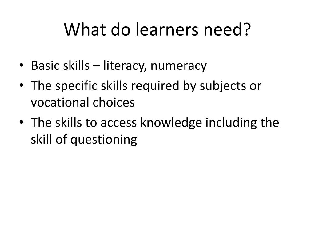 What do learners need? • Basic skills – literacy, numeracy • The specific skills required by subjects or vocational choices • The skills to access knowledge including the skill of questioning