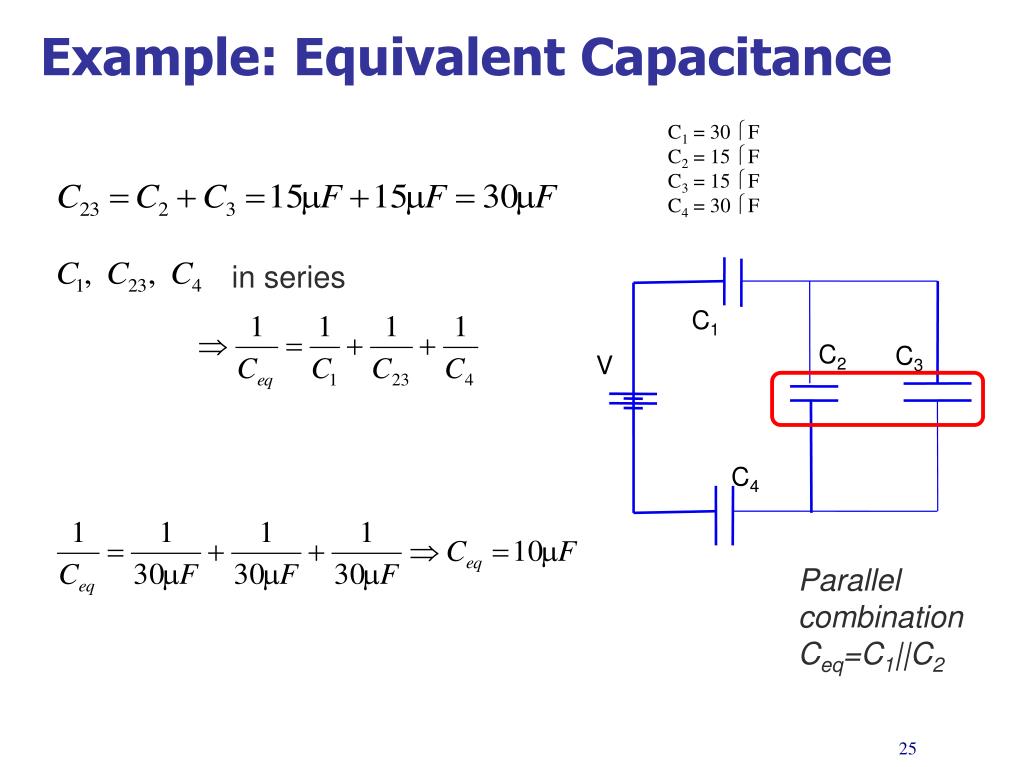 Example: Equivalent Capacitance C1 C2 C3 V C4 C1 = 30 μF C2 = 15 μF C3 = 15 μF C4 = 30 μF in series Parallel combinationCeq=C1||C2