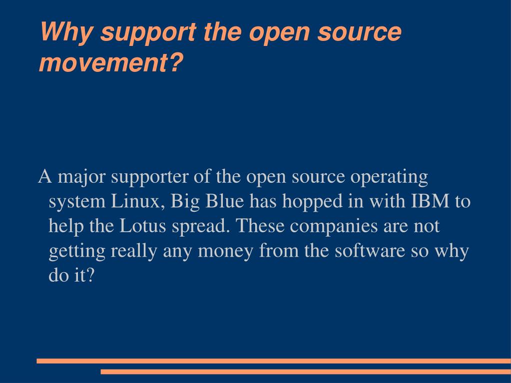 Why support the open source movement? A major supporter of the open source operating system Linux, Big Blue has hopped in with IBM to help the Lotus spread. These companies are not getting really any money from the software so why do it?