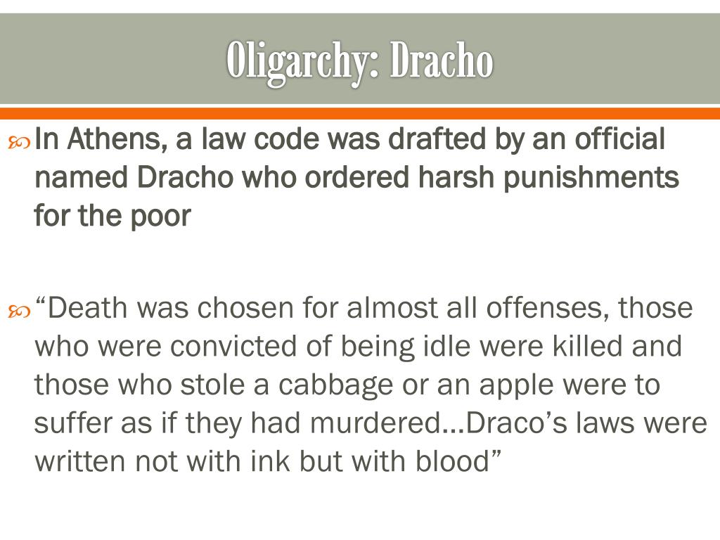 Oligarchy: Dracho • In Athens, a law code was drafted by an official named Dracho who ordered harsh punishments for the poor • “Death was chosen for almost all offenses, those who were convicted of being idle were killed and those who stole a cabbage or an apple were to suffer as if they had murdered…Draco’s laws were written not with ink but with blood”