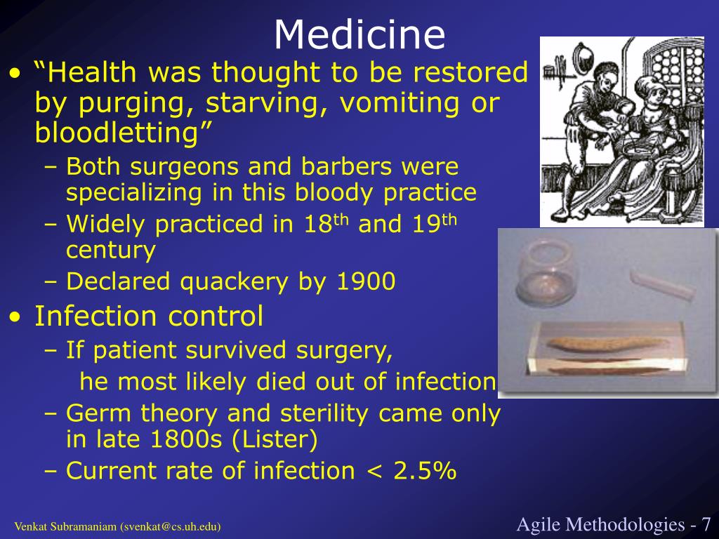 Medicine • “Health was thought to be restored by purging, starving, vomiting or bloodletting” • Both surgeons and barbers were specializing in this bloody practice • Widely practiced in 18th and 19th century • Declared quackery by 1900 • Infection control • If patient survived surgery, he most likely died out of infection • Germ theory and sterility came only in late 1800s (Lister) • Current rate of infection < 2.5%
