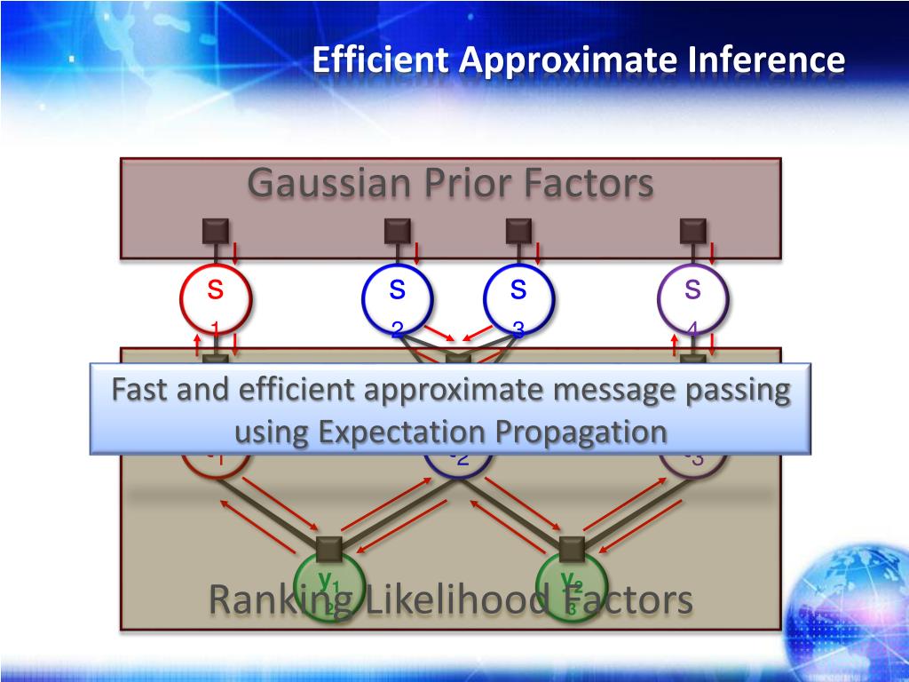 Efficient Approximate Inference Gaussian Prior Factors s1 s2 s3 s4 Ranking Likelihood Factors Fast and efficient approximate message passing using Expectation Propagation t1 t2 t3 y12 y23