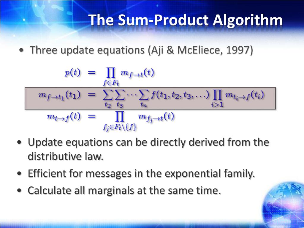 The Sum-Product Algorithm • Three update equations (Aji & McEliece, 1997) • Update equations can be directly derived from the distributive law. • Efficient for messages in the exponential family. • Calculate all marginals at the same time.
