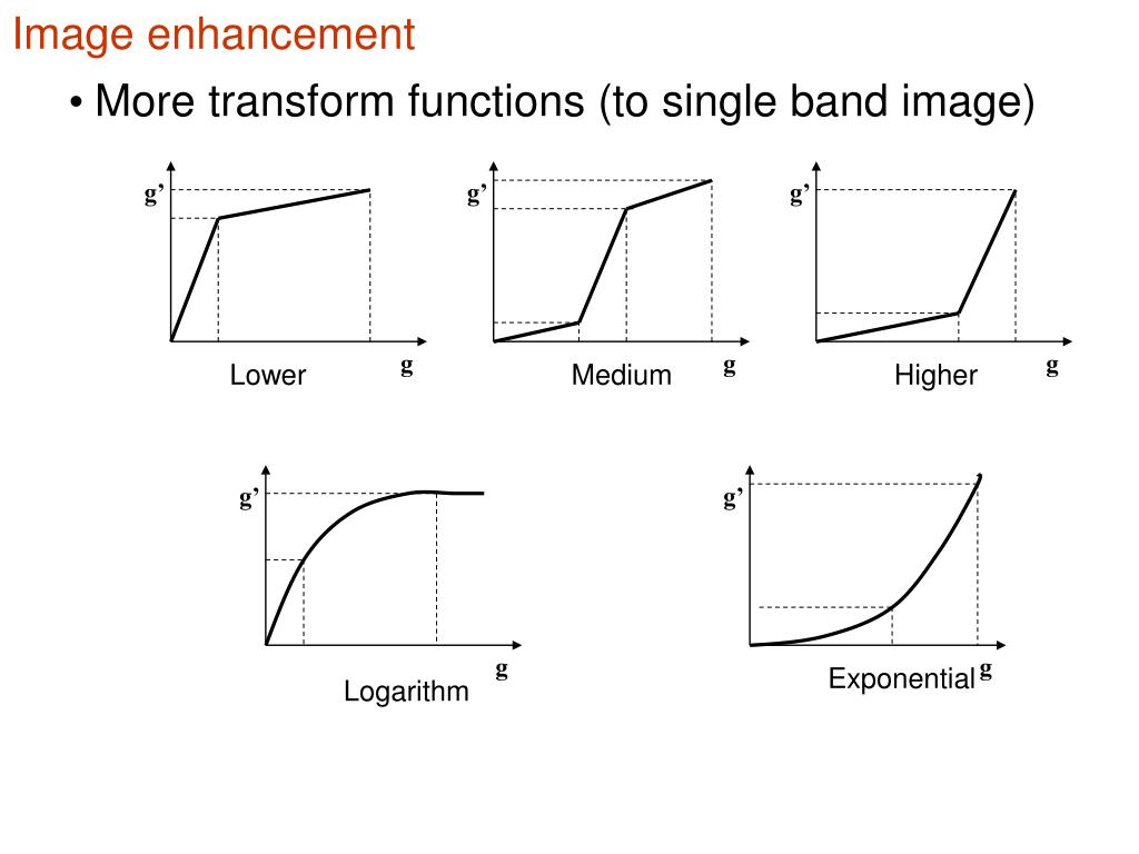 Image enhancement g’ g’ g’ g’ g’ g g g g g More transform functions (to single band image) Lower Medium Higher Exponential Logarithm