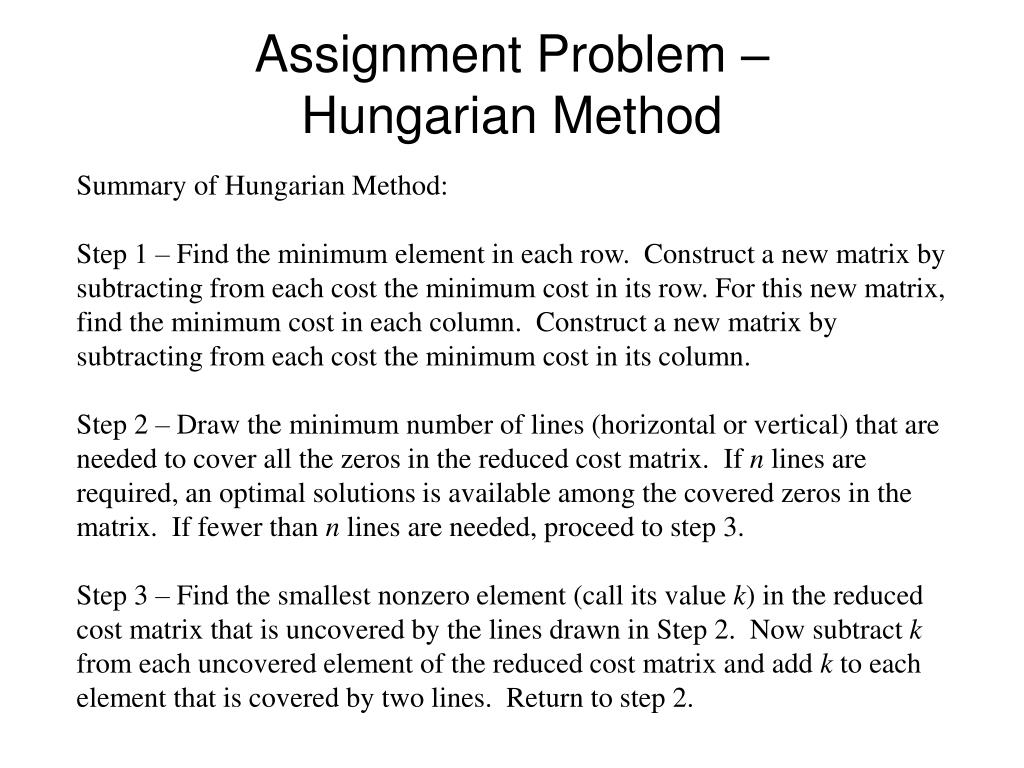 Assignment Problem –Hungarian Method Summary of Hungarian Method: Step 1 – Find the minimum element in each row. Construct a new matrix by subtracting from each cost the minimum cost in its row. For this new matrix, find the minimum cost in each column. Construct a new matrix by subtracting from each cost the minimum cost in its column. Step 2 – Draw the minimum number of lines (horizontal or vertical) that are needed to cover all the zeros in the reduced cost matrix. If n lines are required, an optimal solutions is available among the covered zeros in the matrix. If fewer than n lines are needed, proceed to step 3. Step 3 – Find the smallest nonzero element (call its value k) in the reduced cost matrix that is uncovered by the lines drawn in Step 2. Now subtract k from each uncovered element of the reduced cost matrix and add k to each element that is covered by two lines. Return to step 2.