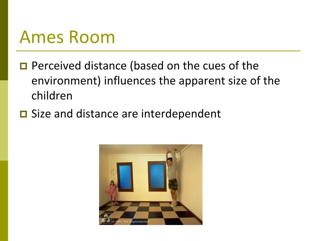 Ames Room • Perceived distance (based on the cues of the environment) influences the apparent size of the children • Size and distance are interdependent