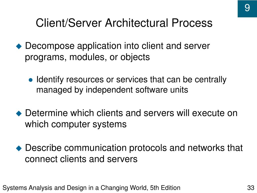 Systems Analysis and Design in a Changing World, 5th Edition Client/Server Architectural Process • Decompose application into client and server programs, modules, or objects • Identify resources or services that can be centrally managed by independent software units • Determine which clients and servers will execute on which computer systems • Describe communication protocols and networks that connect clients and servers
