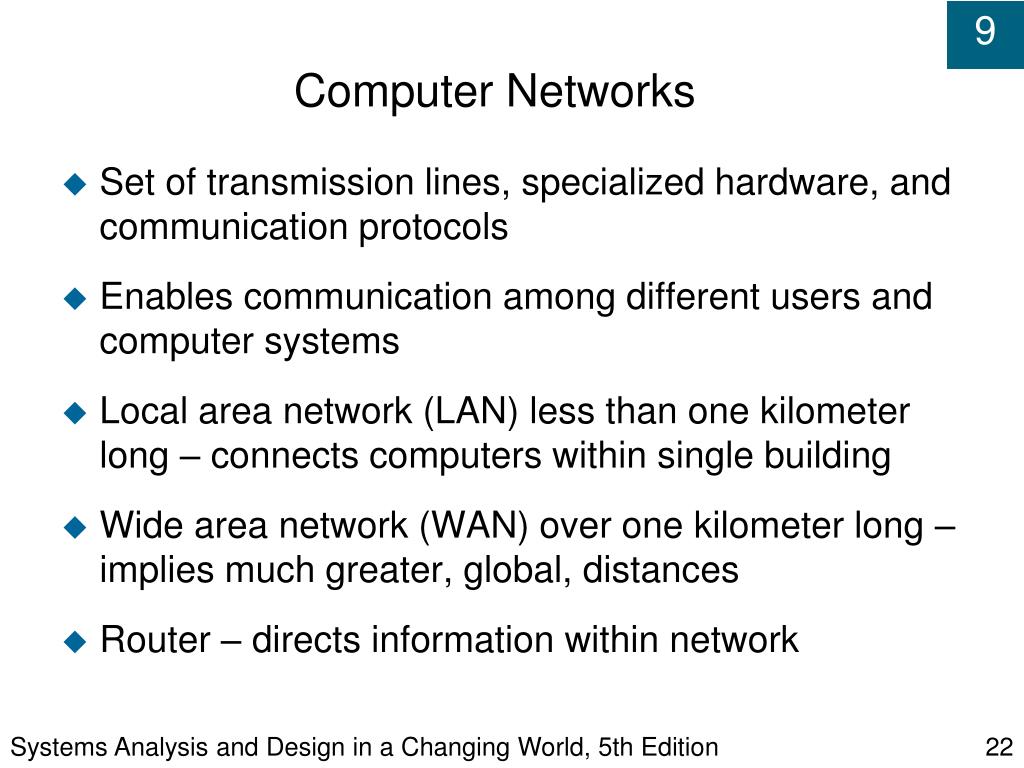 Systems Analysis and Design in a Changing World, 5th Edition Computer Networks • Set of transmission lines, specialized hardware, and communication protocols • Enables communication among different users and computer systems • Local area network (LAN) less than one kilometer long – connects computers within single building • Wide area network (WAN) over one kilometer long – implies much greater, global, distances • Router – directs information within network