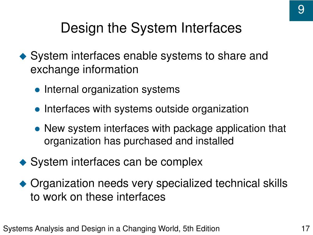 Systems Analysis and Design in a Changing World, 5th Edition Design the System Interfaces • System interfaces enable systems to share and exchange information • Internal organization systems • Interfaces with systems outside organization • New system interfaces with package application that organization has purchased and installed • System interfaces can be complex • Organization needs very specialized technical skills to work on these interfaces