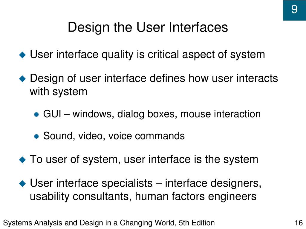 Systems Analysis and Design in a Changing World, 5th Edition Design the User Interfaces • User interface quality is critical aspect of system • Design of user interface defines how user interacts with system • GUI – windows, dialog boxes, mouse interaction • Sound, video, voice commands • To user of system, user interface is the system • User interface specialists – interface designers, usability consultants, human factors engineers