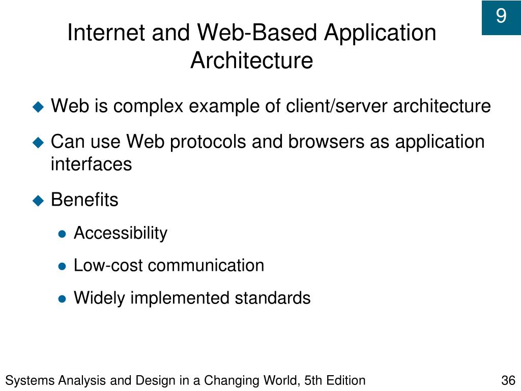 Systems Analysis and Design in a Changing World, 5th Edition Internet and Web-Based Application Architecture • Web is complex example of client/server architecture • Can use Web protocols and browsers as application interfaces • Benefits • Accessibility • Low-cost communication • Widely implemented standards