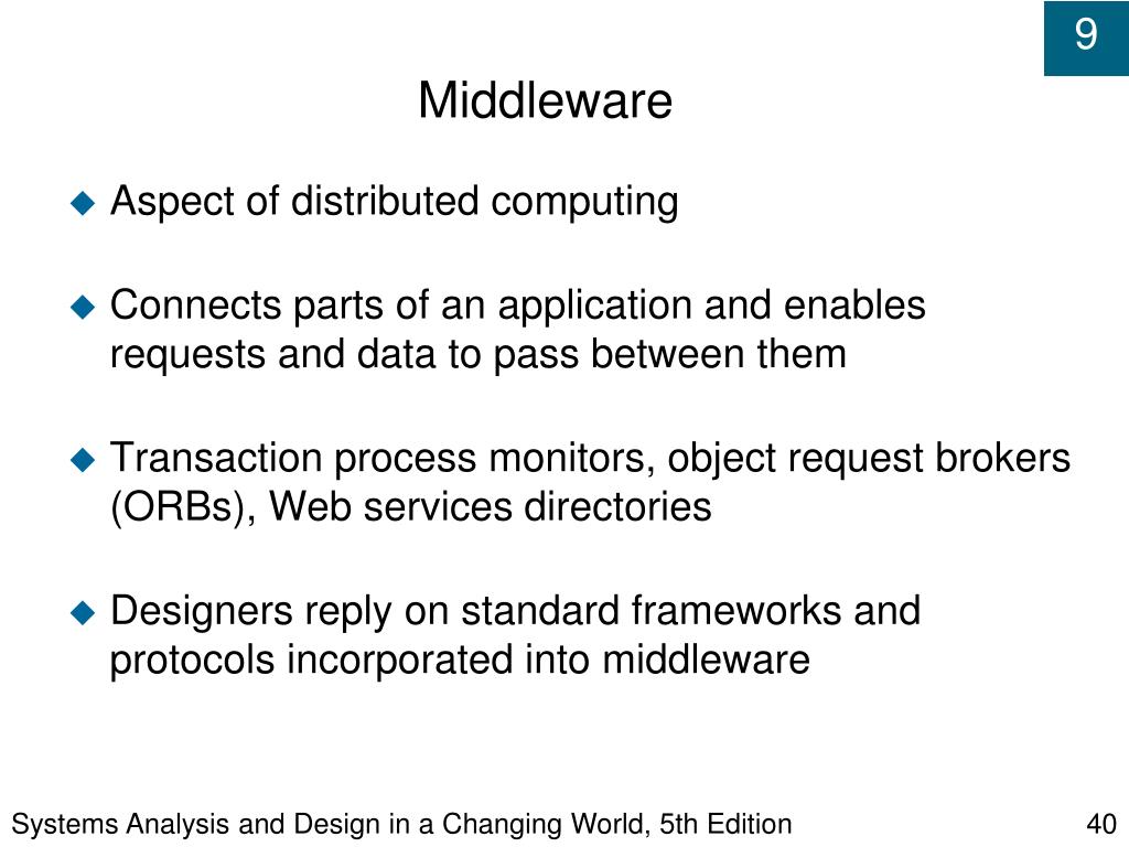 Systems Analysis and Design in a Changing World, 5th Edition Middleware • Aspect of distributed computing • Connects parts of an application and enables requests and data to pass between them • Transaction process monitors, object request brokers (ORBs), Web services directories • Designers reply on standard frameworks and protocols incorporated into middleware