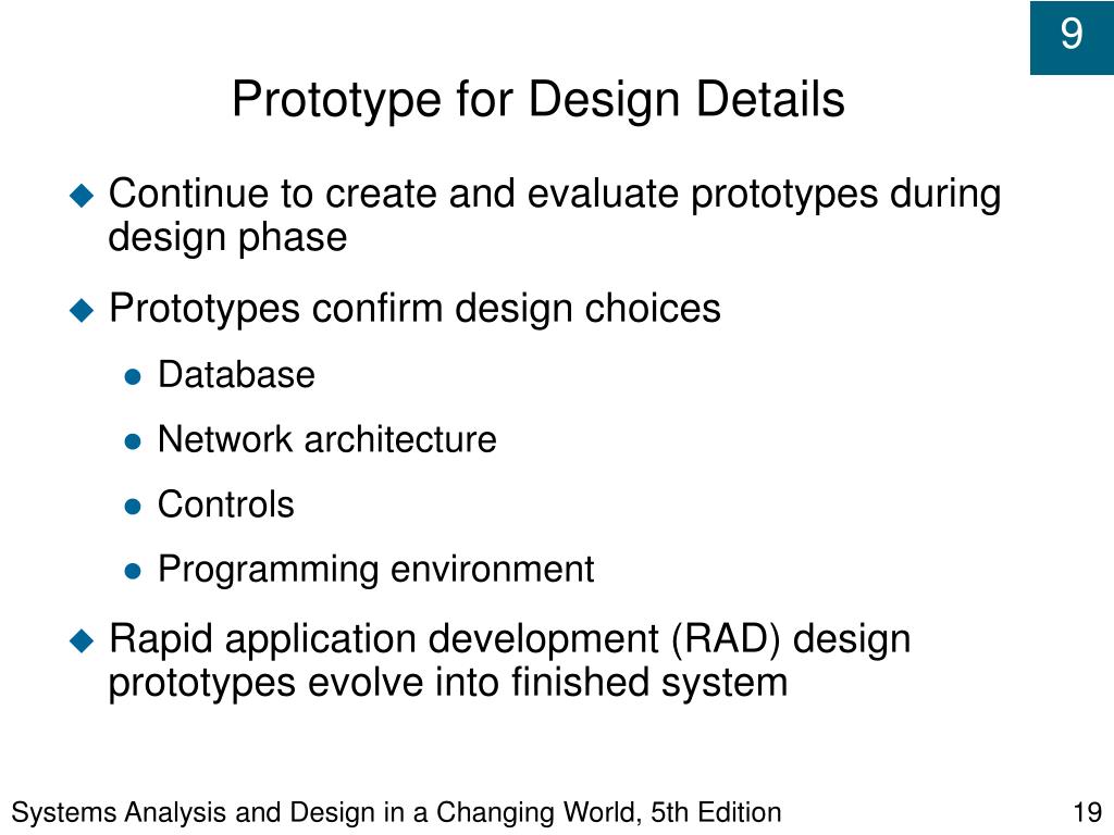 Systems Analysis and Design in a Changing World, 5th Edition Prototype for Design Details • Continue to create and evaluate prototypes during design phase • Prototypes confirm design choices • Database • Network architecture • Controls • Programming environment • Rapid application development (RAD) design prototypes evolve into finished system