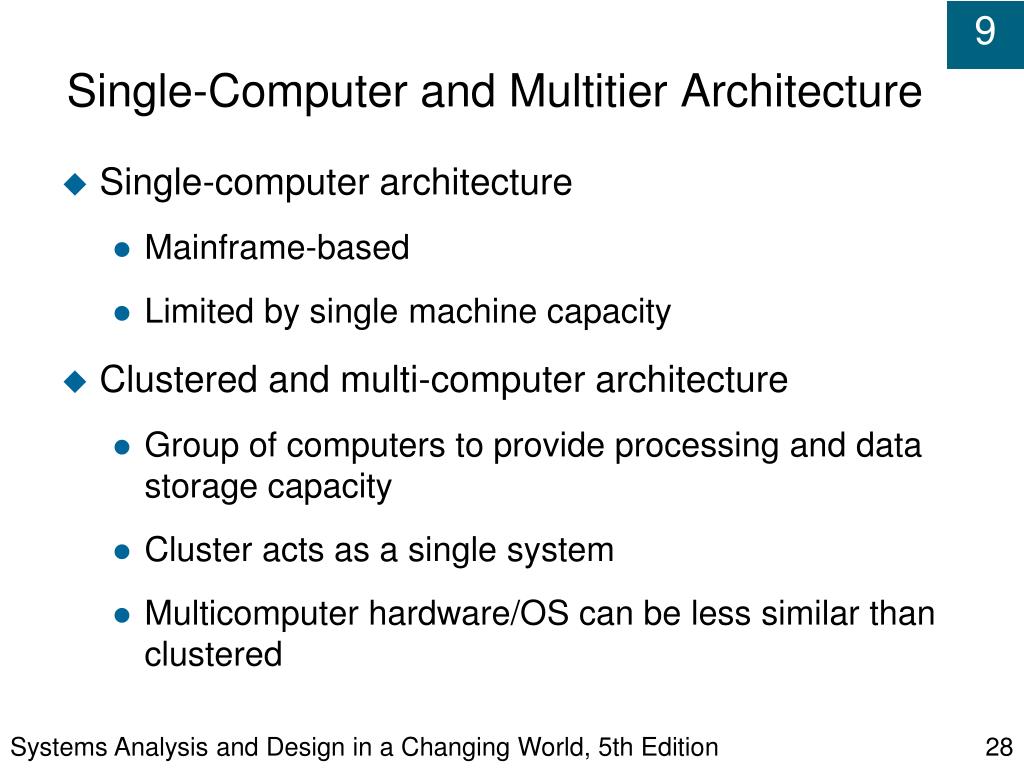 Systems Analysis and Design in a Changing World, 5th Edition Single-Computer and Multitier Architecture • Single-computer architecture • Mainframe-based • Limited by single machine capacity • Clustered and multi-computer architecture • Group of computers to provide processing and data storage capacity • Cluster acts as a single system • Multicomputer hardware/OS can be less similar than clustered