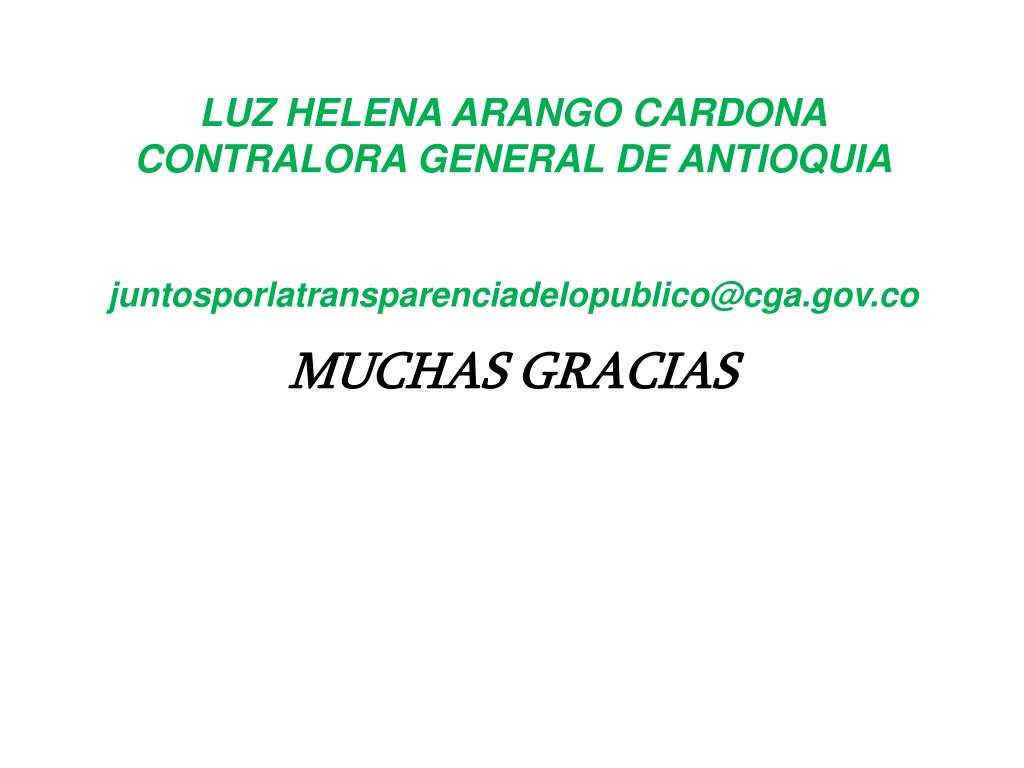 LUZ HELENA ARANGO CARDONACONTRALORA GENERAL DE ANTIOQUIAjuntosporlatransparenciadelopublico@cga.gov.co MUCHAS GRACIAS