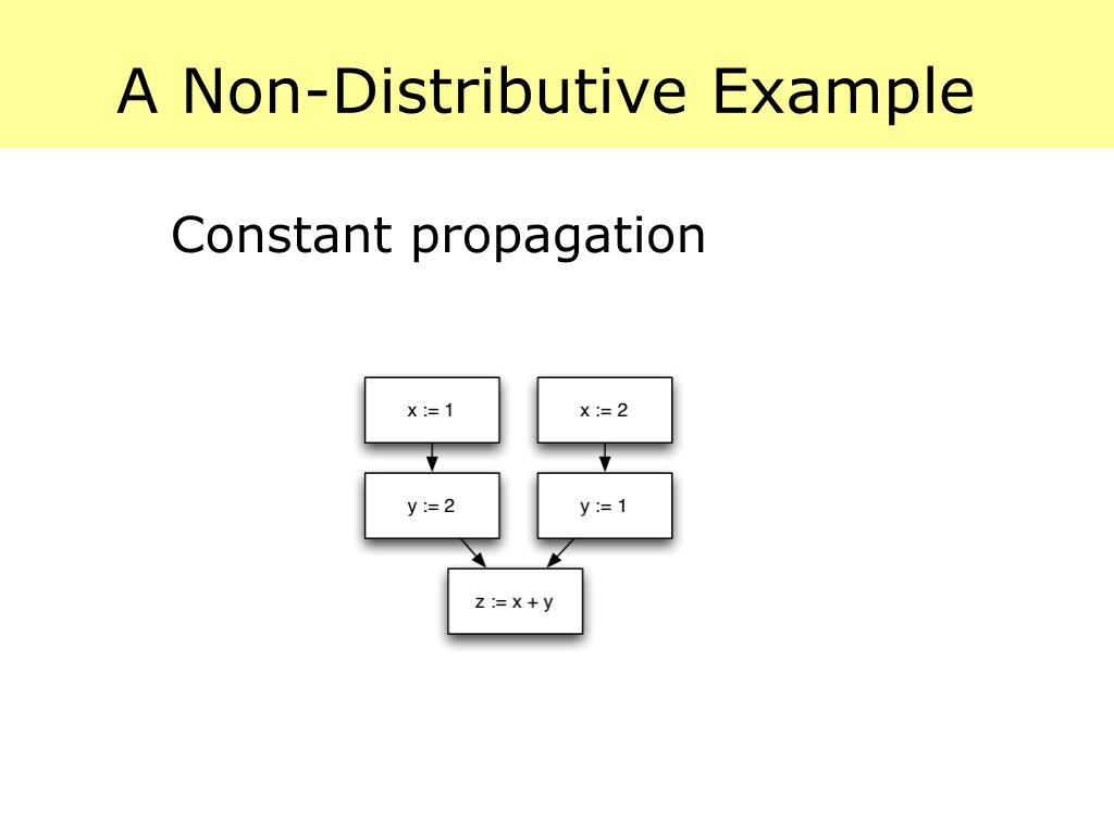 A Non-Distributive Example • Constant propagation • In general, analysis of what the program computes in not distributive