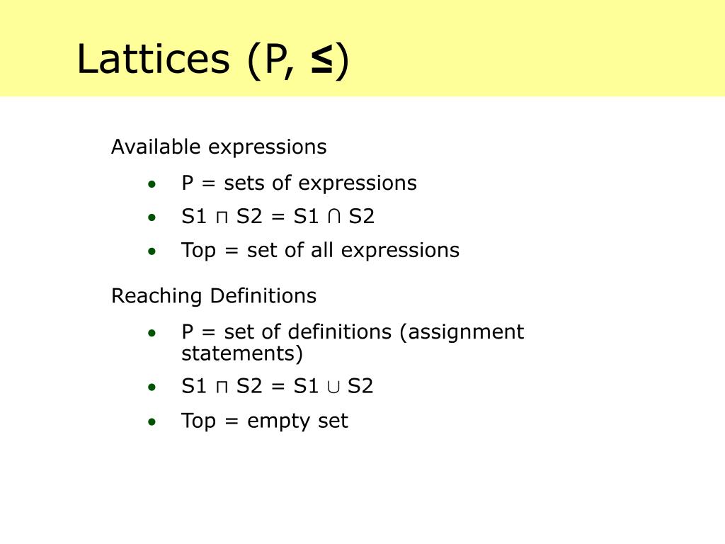 Lattices (P, ≤) • Available expressions • P = sets of expressions • S1 ⊓ S2 = S1 ∩ S2 • Top = set of all expressions • Reaching Definitions • P = set of definitions (assignment statements) • S1 ⊓ S2 = S1 [ S2 • Top = empty set