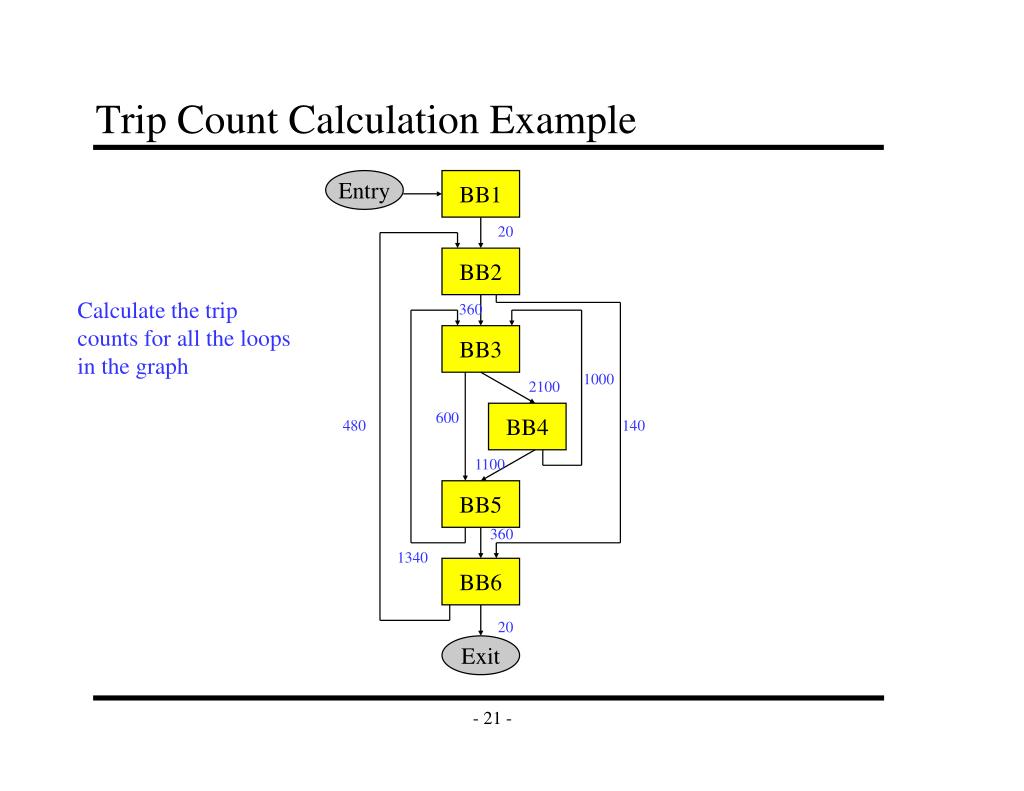 Trip Count Calculation Example Entry BB1 20 BB2 Calculate the trip counts for all the loops in the graph 360 BB3 1000 2100 600 BB4 480 140 1100 BB5 360 1340 BB6 20 Exit