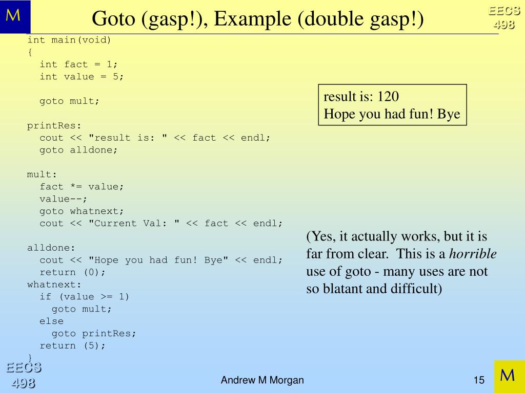 Goto (gasp!), Example (double gasp!) int main(void) { int fact = 1; int value = 5; goto mult; printRes: cout << "result is: " << fact << endl; goto alldone; mult: fact *= value; value--; goto whatnext; cout << "Current Val: " << fact << endl; alldone: cout << "Hope you had fun! Bye" << endl; return (0); whatnext: if (value >= 1) goto mult; else goto printRes; return (5); } result is: 120 Hope you had fun! Bye (Yes, it actually works, but it is far from clear. This is a horrible use of goto - many uses are not so blatant and difficult) Andrew M Morgan