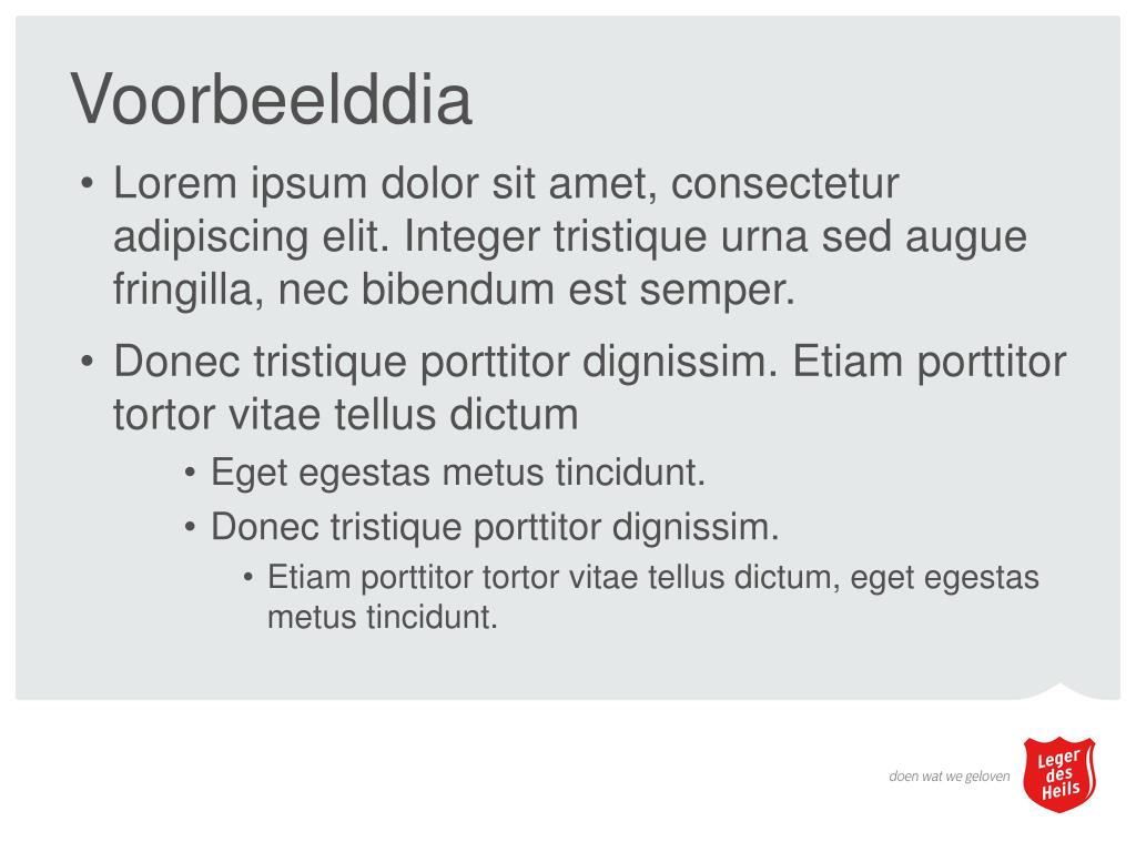 Voorbeelddia • Loremipsumdolorsitamet, consecteturadipiscingelit. Integer tristiqueurnasedauguefringilla, necbibendumest semper. • Donectristiqueporttitordignissim. Etiamporttitortortor vitae tellus dictum • Egetegestasmetustincidunt. • Donectristiqueporttitordignissim. • Etiamporttitortortor vitae tellus dictum, egetegestasmetustincidunt.