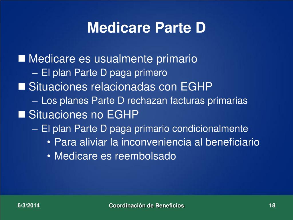Medicare Parte D • Medicare es usualmente primario • El plan Parte D paga primero • Situaciones relacionadas con EGHP • Los planes Parte D rechazan facturas primarias • Situaciones no EGHP • El plan Parte D paga primario condicionalmente • Para aliviar la inconveniencia al beneficiario • Medicare es reembolsado