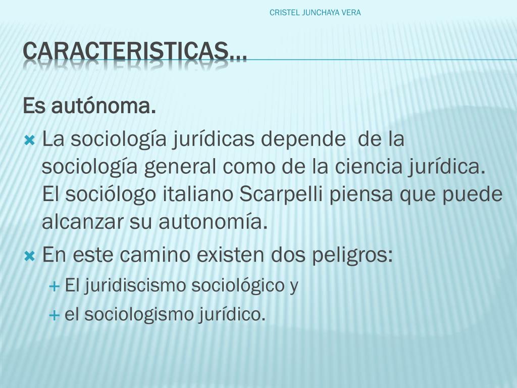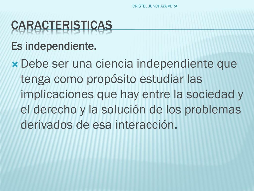 Es independiente. Debe ser una ciencia independiente que tenga como propósito estudiar las implicaciones que hay entre la sociedad y el derecho y la solución de los problemas derivados de esa interacción. CRISTEL JUNCHAYA VERA caracteristicas