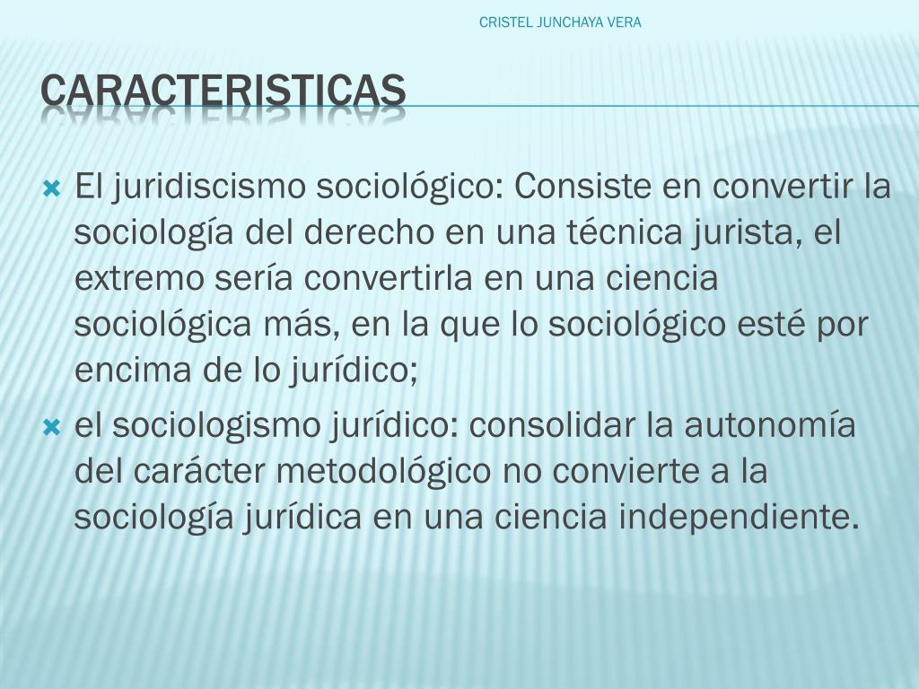 El juridiscismo sociológico: Consiste en convertir la sociología del derecho en una técnica jurista, el extremo sería convertirla en una ciencia sociológica más, en la que lo sociológico esté por encima de lo jurídico; el sociologismo jurídico: consolidar la autonomía del carácter metodológico no convierte a la sociología jurídica en una ciencia independiente. CRISTEL JUNCHAYA VERA caracteristicas