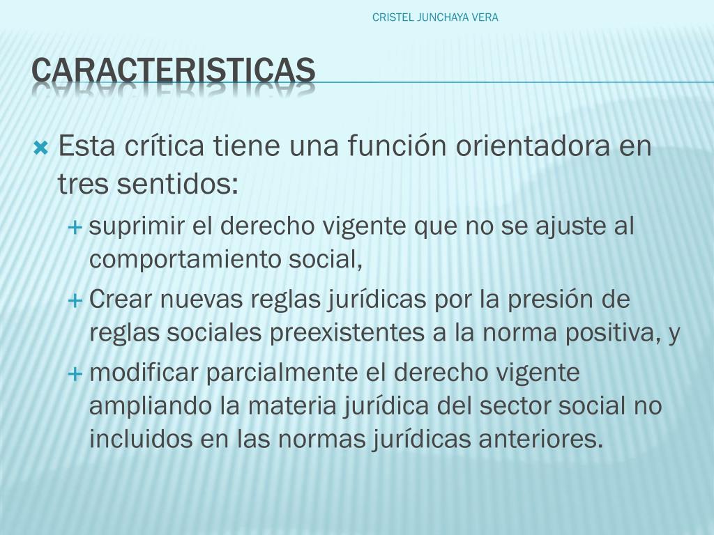 Esta crítica tiene una función orientadora en tres sentidos: • suprimir el derecho vigente que no se ajuste al comportamiento social, • Crear nuevas reglas jurídicas por la presión de reglas sociales preexistentes a la norma positiva, y • modificar parcialmente el derecho vigente ampliando la materia jurídica del sector social no incluidos en las normas jurídicas anteriores. CRISTEL JUNCHAYA VERA caracteristicas