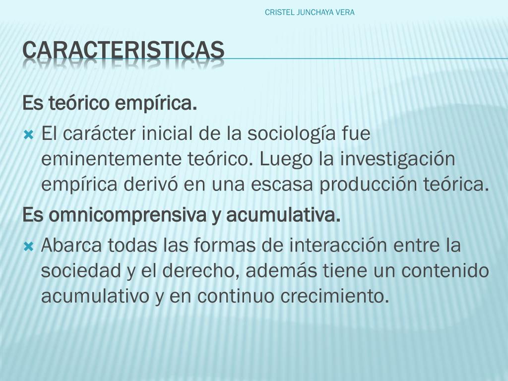 Es teórico empírica. El carácter inicial de la sociología fue eminentemente teórico. Luego la investigación empírica derivó en una escasa producción teórica. Es omnicomprensiva y acumulativa. Abarca todas las formas de interacción entre la sociedad y el derecho, además tiene un contenido acumulativo y en continuo crecimiento. CRISTEL JUNCHAYA VERA CARACTERISTICAS