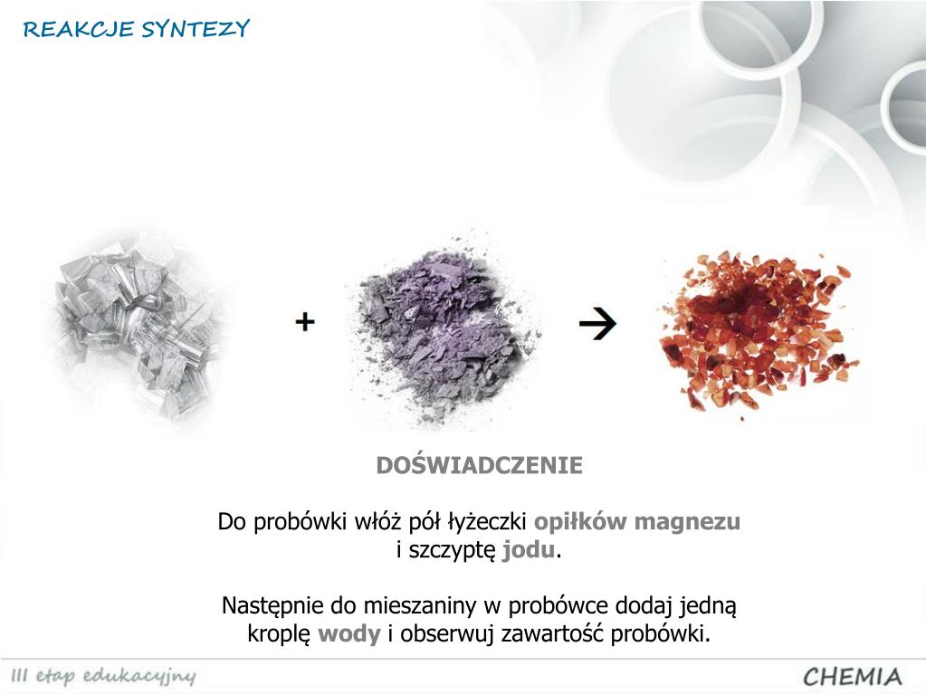 REAKCJE SYNTEZY DOŚWIADCZENIE Do probówki włóż pół łyżeczki opiłków magnezui szczyptę jodu. Następnie do mieszaniny w probówce dodaj jedną kroplę wodyi obserwuj zawartość probówki.