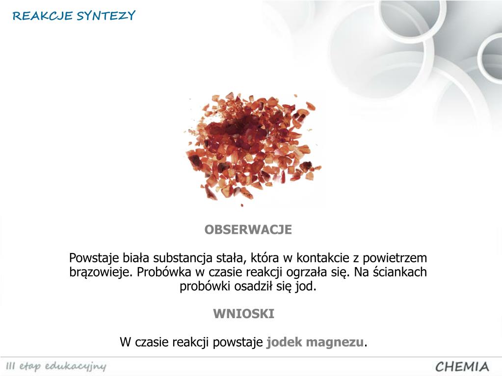 REAKCJE SYNTEZY OBSERWACJE Powstaje biała substancja stała, która w kontakcie z powietrzem brązowieje. Probówka w czasie reakcji ogrzała się. Na ściankach probówki osadził się jod. WNIOSKI W czasie reakcji powstaje jodek magnezu.