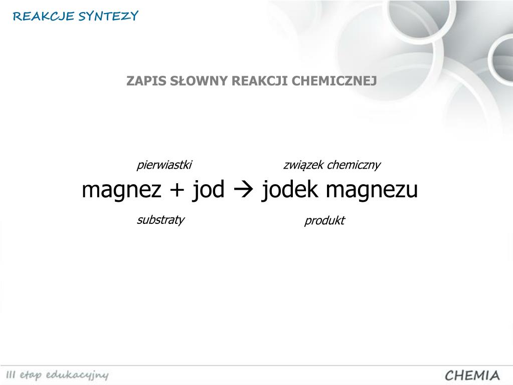 REAKCJE SYNTEZY ZAPIS SŁOWNY REAKCJI CHEMICZNEJ pierwiastki związek chemiczny magnez + jod jodek magnezu substraty produkt