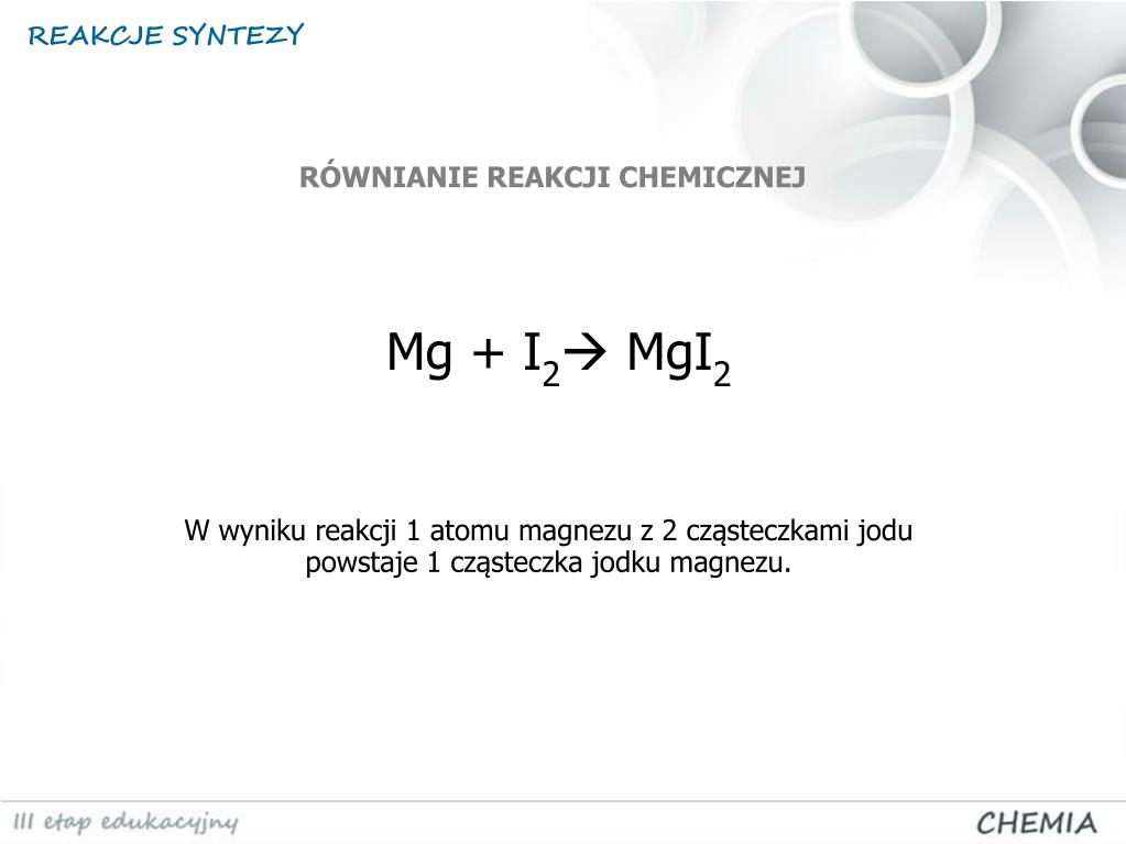 REAKCJE SYNTEZY RÓWNIANIE REAKCJI CHEMICZNEJ Mg + I2 MgI2 W wyniku reakcji 1 atomu magnezu z 2 cząsteczkami jodu powstaje 1 cząsteczka jodku magnezu.