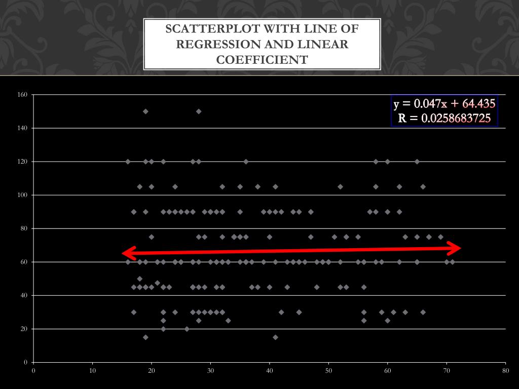 ANALAYSIS • In analyzing a relation between age and time spent at the gym, we found no correlation. • Overall, data for gym goers was found to have a correlation coefficient of (r=.0258683725), much less than the critical value (.195) at .05 with 100 degrees of freedom (the largest data available on the table). • Age does not affect the amount of time spent in the gym. • We are 95% confident that a relationship exists because r*p < .05 or .195*.0001<.05 and because .0000195 is less than .05 we know the relationship exists.