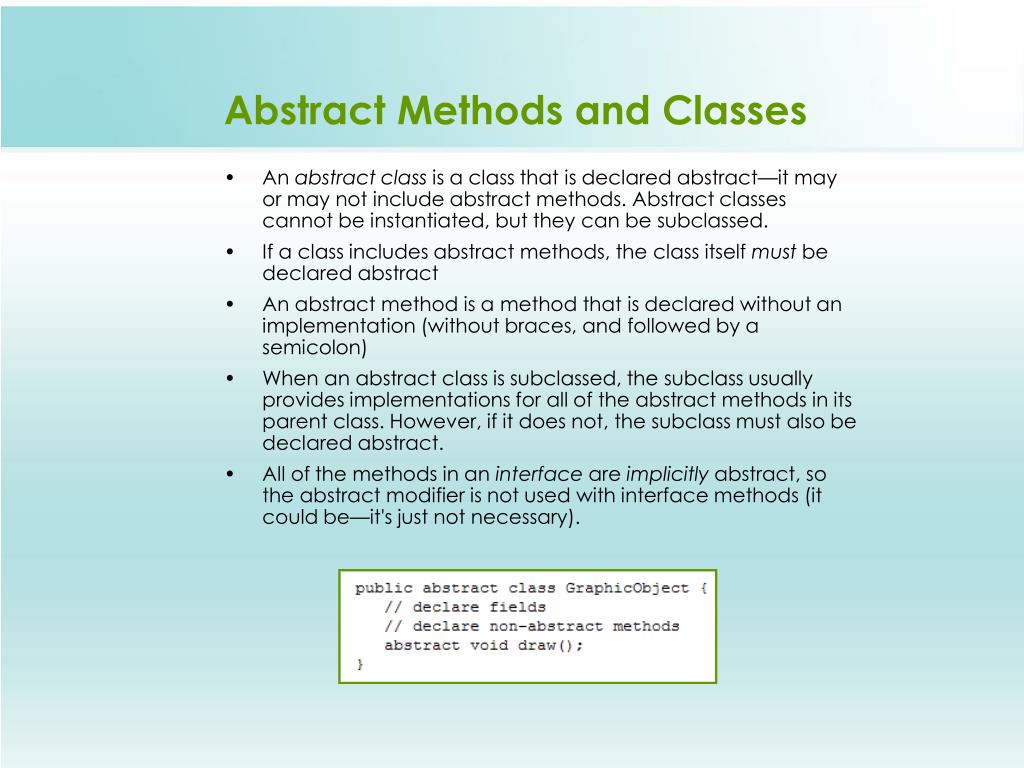 Abstract Methods and Classes • An abstract class is a class that is declared abstract—it may or may not include abstract methods. Abstract classes cannot be instantiated, but they can be subclassed. • If a class includes abstract methods, the class itself must be declared abstract • An abstract method is a method that is declared without an implementation (without braces, and followed by a semicolon) • When an abstract class is subclassed, the subclass usually provides implementations for all of the abstract methods in its parent class. However, if it does not, the subclass must also be declared abstract. • All of the methods in an interface are implicitly abstract, so the abstract modifier is not used with interface methods (it could be—it's just not necessary).