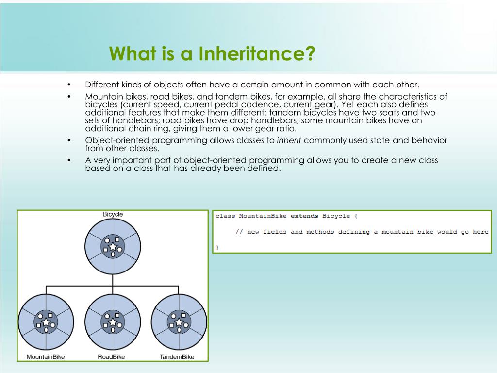What is a Inheritance? • Different kinds of objects often have a certain amount in common with each other. • Mountain bikes, road bikes, and tandem bikes, for example, all share the characteristics of bicycles (current speed, current pedal cadence, current gear). Yet each also defines additional features that make them different: tandem bicycles have two seats and two sets of handlebars; road bikes have drop handlebars; some mountain bikes have an additional chain ring, giving them a lower gear ratio. • Object-oriented programming allows classes to inherit commonly used state and behavior from other classes. • A very important part of object-oriented programming allows you to create a new class based on a class that has already been defined.