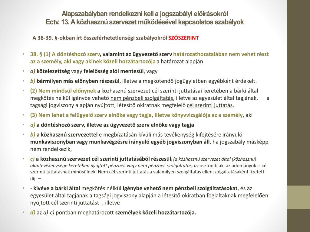 Alapszabályban rendelkezni kell a jogszabályi előírásokrólEctv. 13. A közhasznú szervezet működésével kapcsolatos szabályok A 38-39. §-okban írt összeférhetetlenségi szabályokról SZÓSZERINT • 38. § (1) A döntéshozó szerv, valamint az ügyvezető szerv határozathozatalábannem vehet részt az a személy, aki vagy akinek közeli hozzátartozójaa határozat alapján • a) kötelezettség vagy felelősség alól mentesül, vagy • b) bármilyen más előnyben részesül, illetve a megkötendő jogügyletben egyébként érdekelt. • (2) Nem minősül előnynek a közhasznú szervezet cél szerinti juttatásai keretében a bárki által megkötés nélkül igénybe vehető nem pénzbeli szolgáltatás, illetve az egyesület által tagjának, a tagsági jogviszony alapján nyújtott, létesítő okiratnak megfelelő cél szerinti juttatás. • (3) Nem lehet a felügyelő szerv elnöke vagy tagja, illetve könyvvizsgálója az a személy, aki • a) a döntéshozó szerv, illetve az ügyvezető szerv elnöke vagy tagja • b) a közhasznú szervezettel e megbízatásán kívüli más tevékenység kifejtésére irányuló munkaviszonyban vagy munkavégzésre irányuló egyéb jogviszonyban áll, ha jogszabály másképp nem rendelkezik, • c) a közhasznú szervezet cél szerinti juttatásából részesül; (a közhasznú szervezet által (közhasznú) alaptevékenysége keretében nyújtott pénzbeli vagy nem pénzbeli szolgáltatás, az ösztöndíjak, az adományok is cél szerinti juttatásnak minősülnek. Nem cél szerinti juttatás a valamilyen szolgáltatás ellenszolgáltatásaként fizetett díj.– • - kivéve a bárki által megkötés nélkül igénybe vehető nem pénzbeli szolgáltatásokat, és az egyesület által tagjának a tagsági jogviszony alapján a létesítő okiratban foglaltaknak megfelelően nyújtott cél szerinti juttatást -, illetve • d)az a)-c) pontban meghatározott személyek közeli hozzátartozója.