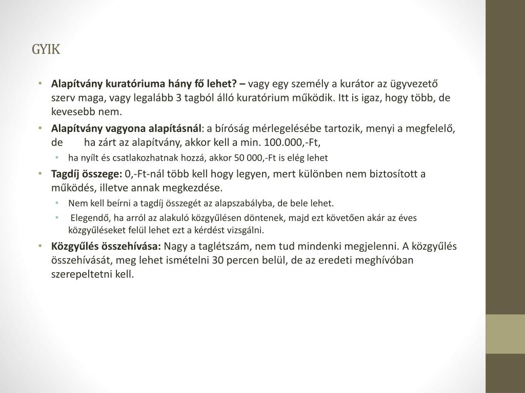 GYIK • Alapítvány kuratóriuma hány fő lehet? – vagy egy személy a kurátor az ügyvezető szerv maga, vagy legalább 3 tagból álló kuratórium működik. Itt is igaz, hogy több, de kevesebb nem. • Alapítvány vagyona alapításnál: a bíróság mérlegelésébe tartozik, menyi a megfelelő, de ha zárt az alapítvány, akkor kell a min. 100.000,-Ft, • ha nyílt és csatlakozhatnak hozzá, akkor 50 000,-Ft is elég lehet • Tagdíj összege: 0,-Ft-nál több kell hogy legyen, mert különben nem biztosított a működés, illetve annak megkezdése. • Nem kell beírni a tagdíj összegét az alapszabályba, de bele lehet. • Elegendő, ha arról az alakuló közgyűlésen döntenek, majd ezt követően akár az éves közgyűléseket felül lehet ezt a kérdést vizsgálni. • Közgyűlés összehívása: Nagy a taglétszám, nem tud mindenki megjelenni. A közgyűlés összehívását, meg lehet ismételni 30 percen belül, de az eredeti meghívóban szerepeltetni kell.