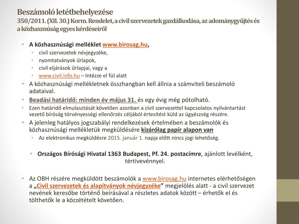Beszámoló letétbehelyezése350/2011. (XII. 30.) Korm. Rendelet, a civil szervezetek gazdálkodása, az adománygyűjtés és a közhasznúság egyes kérdéseiről • A közhasznúsági melléklet www.birosag.hu, • civil szervezetek névjegyzéke, • nyomtatványok űrlapok, • civil eljárások űrlapjai, vagy a • www.civil.info.hu – Intézze el fül alatt • A közhasznúsági mellékletnek összhangban kell állnia a számviteli beszámoló adataival. • Beadási határidő: minden év május 31. ésegy évig még pótolható. • Ezen határidő elmulasztását követően azonban a civil szervezettel kapcsolatos nyilvántartást vezető bíróság törvényességi ellenőrzés céljából értesítést küld az ügyészség részére. • A jelenleg hatályos jogszabályi rendelkezések értelmében a beszámolók és közhasznúsági mellékletük megküldésére kizárólag papír alapon van • Az elektronikus megküldésre 2015. január 1. napja előtt nincs jogi lehetőség. • Országos Bírósági Hivatal 1363 Budapest, Pf. 24. postacímre, ajánlott levélként, tértivevénnyel. • Az OBH részére megküldött beszámolók a www.birosag.hu internetes elérhetőségen a „Civil szervezetek és alapítványok névjegyzéke” megjelölés alatt - a civil szervezet nevének keresőbe történő beírásával a részletes adatok között – érhetők el és tölthetők le a közzétételt követően.
