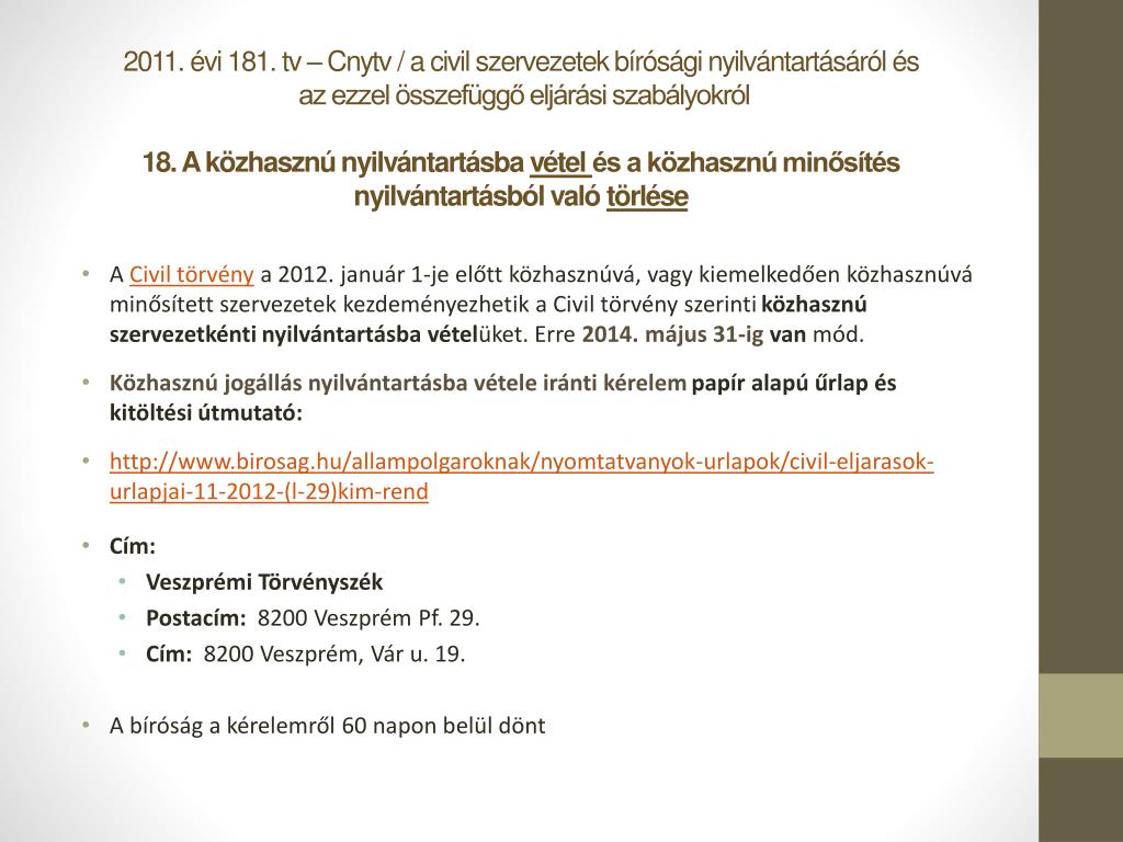 2011. évi 181. tv – Cnytv / a civil szervezetek bírósági nyilvántartásáról és az ezzel összefüggő eljárási szabályokról 18. A közhasznú nyilvántartásba vétel és a közhasznú minősítés nyilvántartásból való törlése • A Civil törvény a 2012. január 1-je előtt közhasznúvá, vagy kiemelkedően közhasznúvá minősített szervezetek kezdeményezhetik a Civil törvény szerinti közhasznú szervezetkénti nyilvántartásba vételüket. Erre 2014. május 31-ig van mód. • Közhasznú jogállás nyilvántartásba vétele iránti kérelem papír alapú űrlap és kitöltési útmutató: • http://www.birosag.hu/allampolgaroknak/nyomtatvanyok-urlapok/civil-eljarasok-urlapjai-11-2012-(l-29)kim-rend • Cím: • Veszprémi Törvényszék • Postacím: 8200 Veszprém Pf. 29. • Cím: 8200 Veszprém, Vár u. 19. • A bíróság a kérelemről 60 napon belül dönt