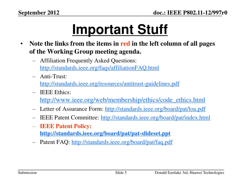 Important Stuff • Note the links from the items in red in the left column of all pages of the Working Group meeting agenda. • Affiliation Frequently Asked Questions: http://standards.ieee.org/faqs/affiliationFAQ.html • Anti-Trust: http://standards.ieee.org/resources/antitrust-guidelines.pdf • IEEE Ethics: http://www.ieee.org/web/membership/ethics/code_ethics.html • Letter of Assurance Form: http://standards.ieee.org/board/pat/loa.pdf • IEEE Patent Committee: http://standards.ieee.org/board/pat/index.html • IEEE Patent Policy: http://standards.ieee.org/board/pat/pat-slideset.ppt • Patent FAQ: http://standards.ieee.org/board/pat/faq.pdf Donald Eastlake 3rd, Huawei Technologies