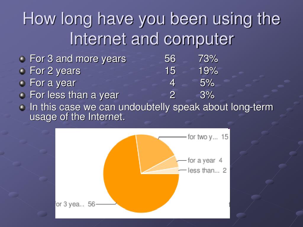 How long have you been using the Internet and computer • For 3 and more years5673% • For 2 years1519% • For a year4 5% • For less than a year 2 3% • In this case we can undoubtelly speak about long-term usage of the Internet.