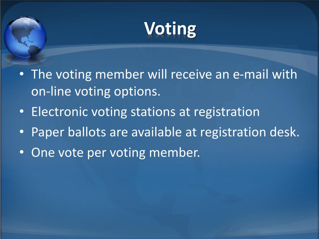 Voting • The voting member will receive an e-mail with on-line voting options. • Electronic voting stations at registration • Paper ballots are available at registration desk. • One vote per voting member.