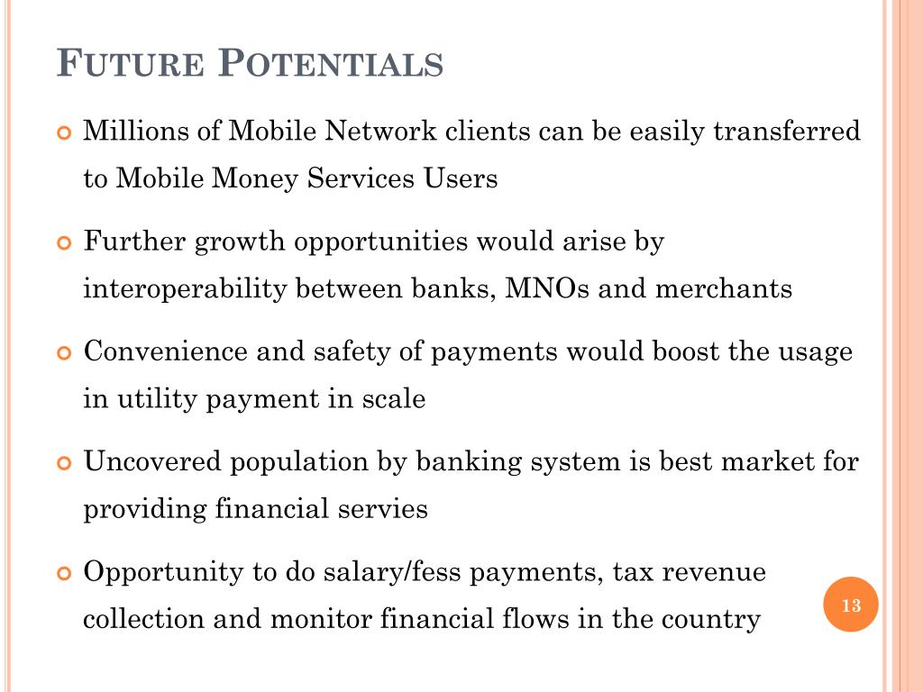 Future Potentials • Millions of Mobile Network clients can be easily transferred to Mobile Money Services Users • Further growth opportunities would arise by interoperability between banks, MNOs and merchants • Convenience and safety of payments would boost the usage in utility payment in scale • Uncovered population by banking system is best market for providing financial servies • Opportunity to do salary/fess payments, tax revenue collection and monitor financial flows in the country
