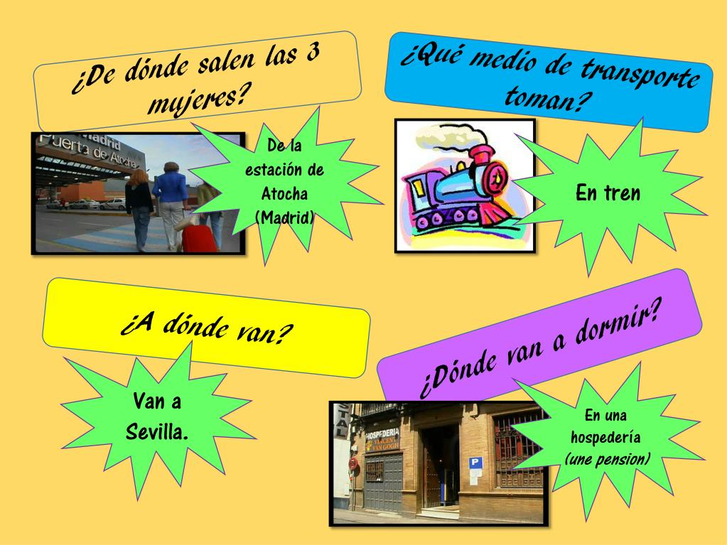 ¿Qué medio de transporte toman? ¿De dóndesalen las 3 mujeres? De la estación de Atocha (Madrid) En tren ¿A dónde van? ¿Dónde van a dormir? Van a Sevilla. En unahospedería(une pension)