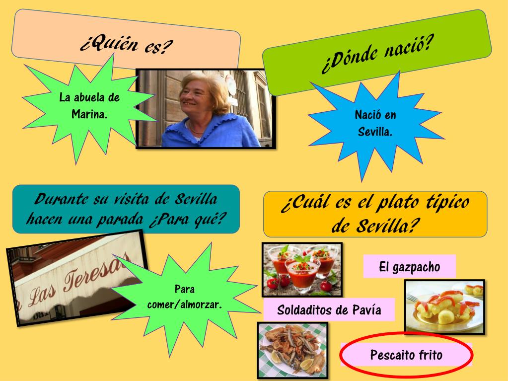 ¿Quién es? ¿Dóndenació? La abuela de Marina. Nació en Sevilla. Durante su visita de Sevilla hacenuna parada ¿Para qué? ¿Cuál es el platotípico de Sevilla? Para comer/almorzar. El gazpacho Soldaditos de Pavía Pescaitofrito