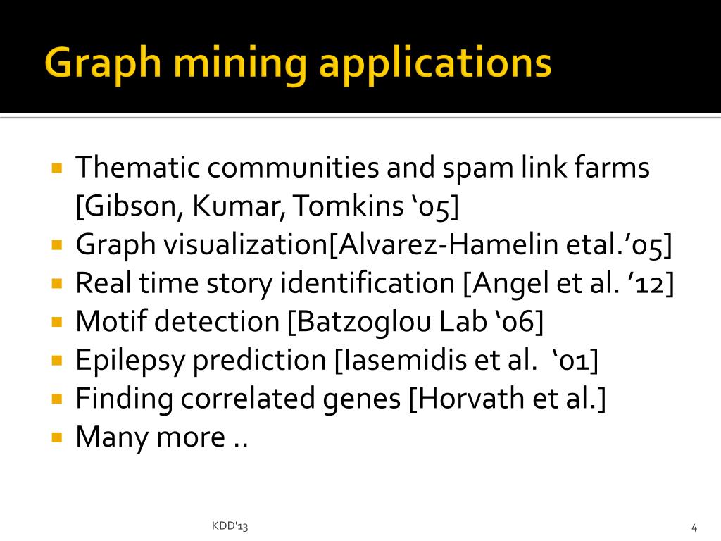 Graph mining applications • Thematic communities and spam link farms[Gibson, Kumar, Tomkins ‘05] • Graph visualization[Alvarez-Hamelin etal.’05] • Real time story identification [Angel et al. ’12] • Motif detection [Batzoglou Lab ‘06] • Epilepsy prediction [Iasemidis et al. ‘01] • Finding correlated genes [Horvath et al.] • Many more .. KDD'13