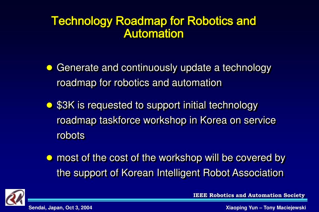 Technology Roadmap for Robotics and Automation • Generate and continuously update a technology roadmap for robotics and automation • $3K is requested to support initial technology roadmap taskforce workshop in Korea on service robots • most of the cost of the workshop will be covered by the support of Korean Intelligent Robot Association